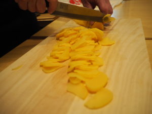 たくあんは薄切りにし、音があまり立たないようにします。