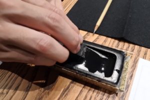 「一行写経と法話の会」では墨汁を使うのではなく、墨をするところから行います。