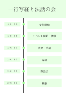 今回で第6回目を迎える「一行写経と法話の会」ですが、このイベントは写経するお経の一節や仏教の言葉について法話(説法)を聞いて頂き、その後で私たちと共に写経をしていただきます。ちなみに一行というのはあくまでもお経の一節ということで、実際写経していただく時は4~5行になりますが、悪しからず。