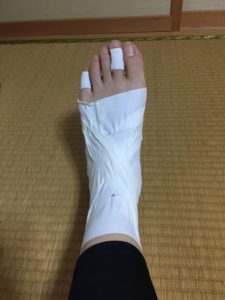 白のテーピングが痛々しさを増長させておりますが、実際痛々しいどころではなく、右足首に比べるとパンパンに腫れています。