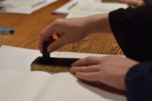 墨汁とはまた違う、墨の香りが徐々に広まります。ただ、墨を磨るのは小学生以来なので、ちょうどいい濃さがわからない…。