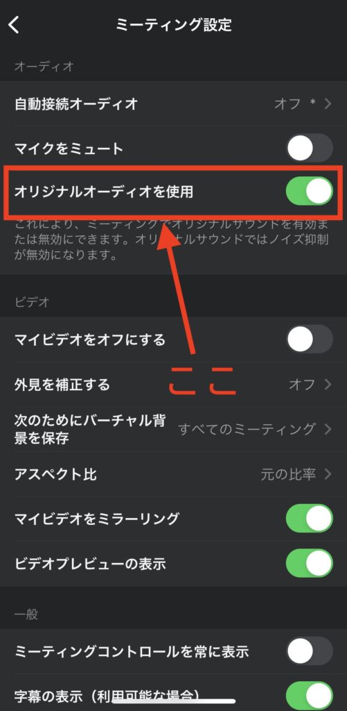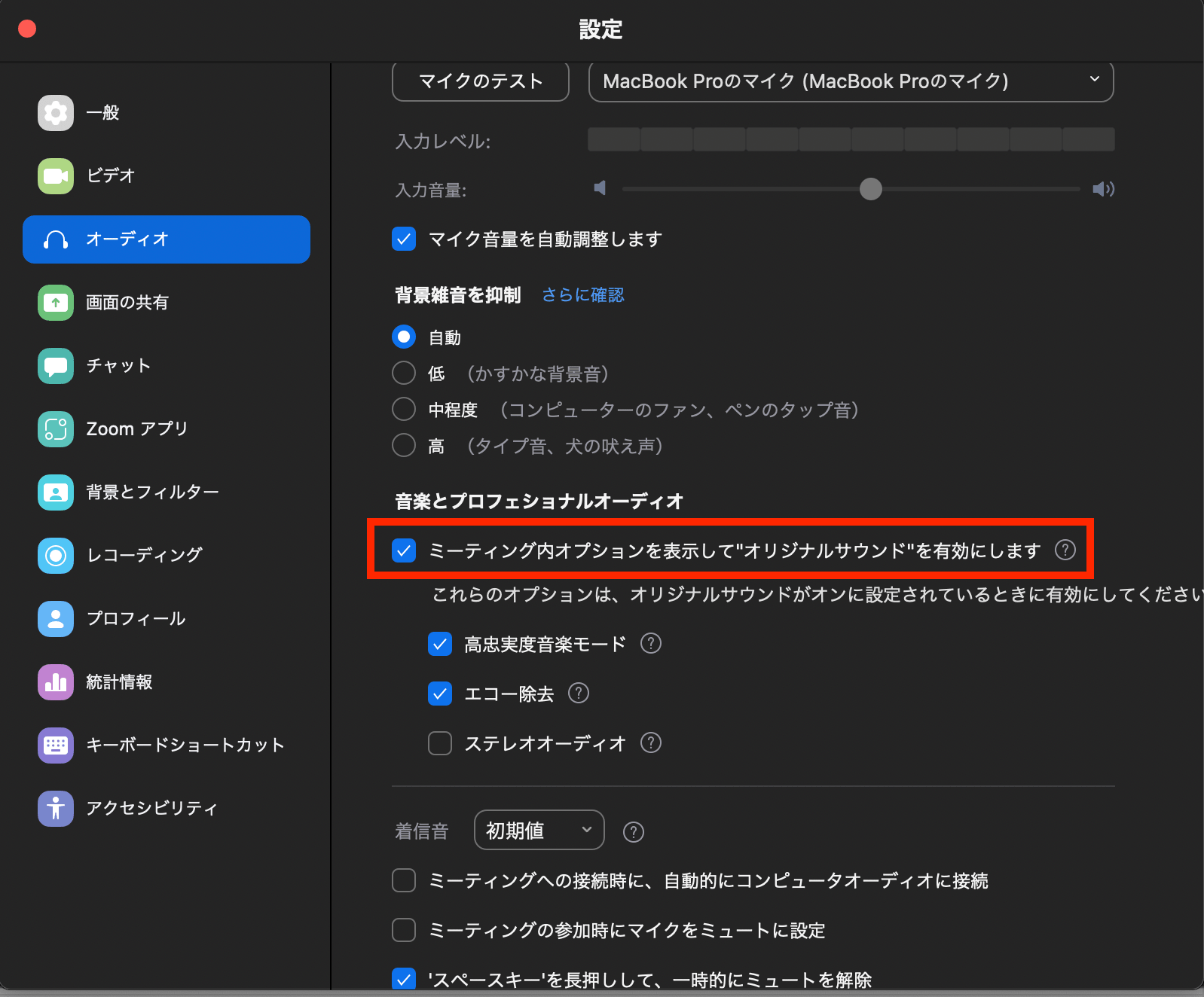 続いてオーディオの項目内にある「ミーティングオプションを表示して"オリジナルサウンド"を有効にします」のチェックボックスにチェックを入れます。