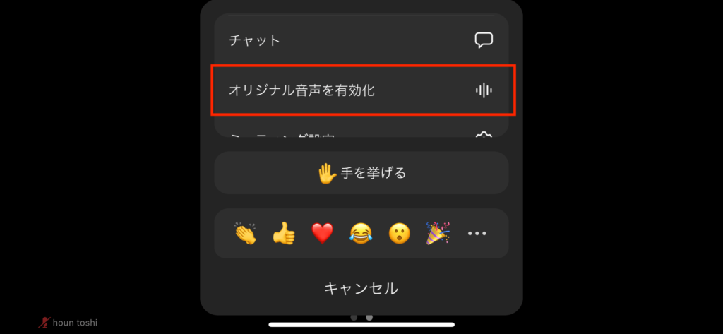 これを有効にして、実際のミーティング画面でオリジナルサウンドをオンにしてみると…。