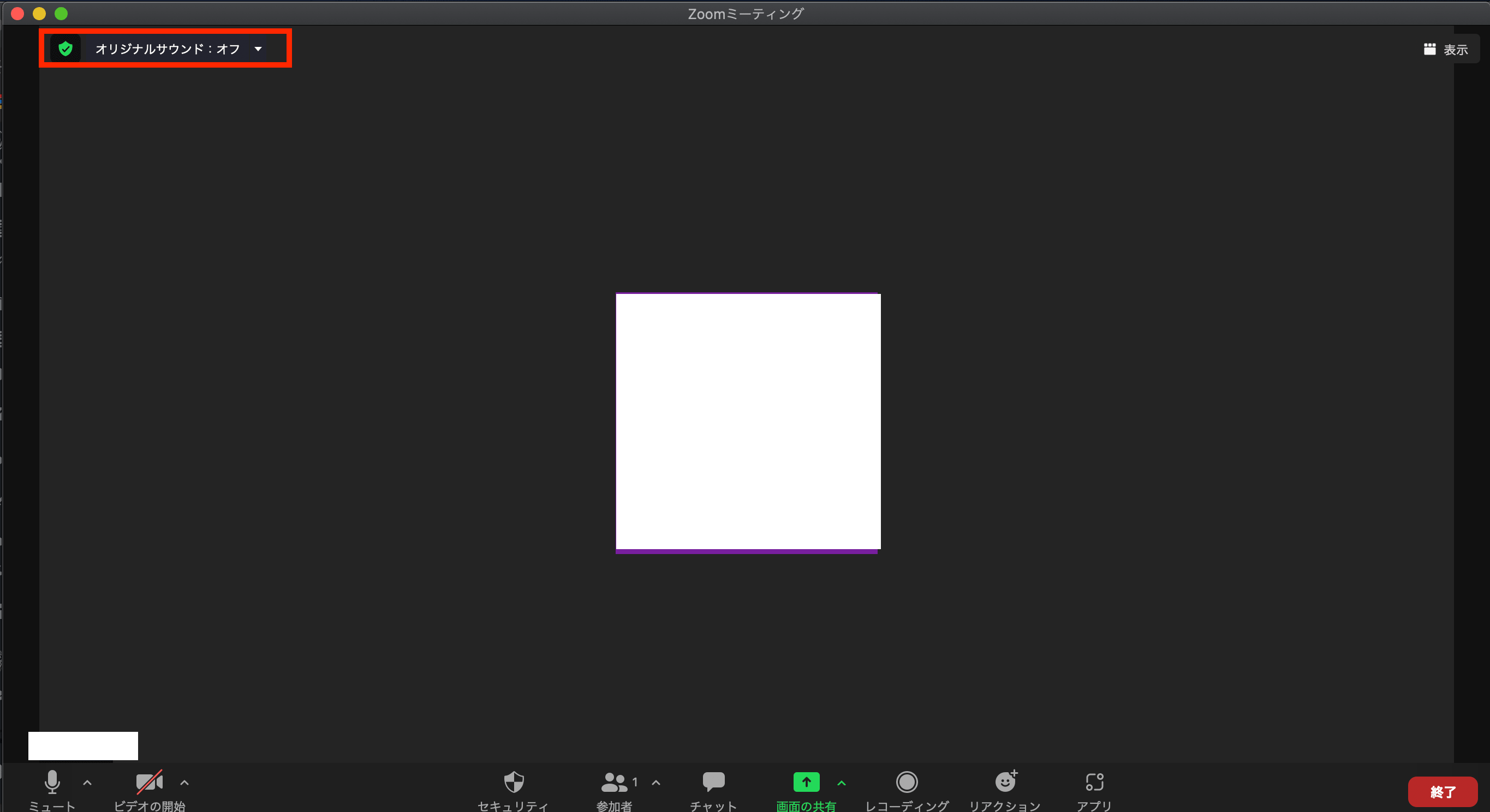 するとミーティング画面左上に「オリジナルサウンド:オフ」というオプションが表示されるようになります。