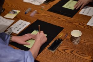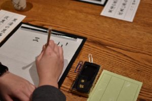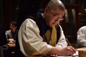 法話を担当した久保田もいつになく真剣な面持ちで筆を動かします。